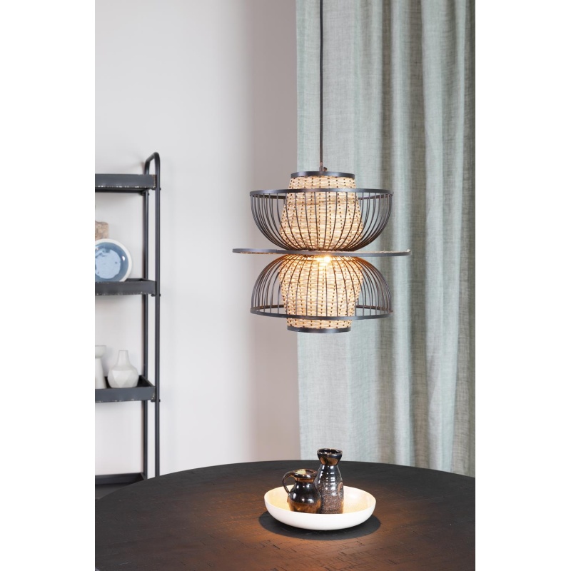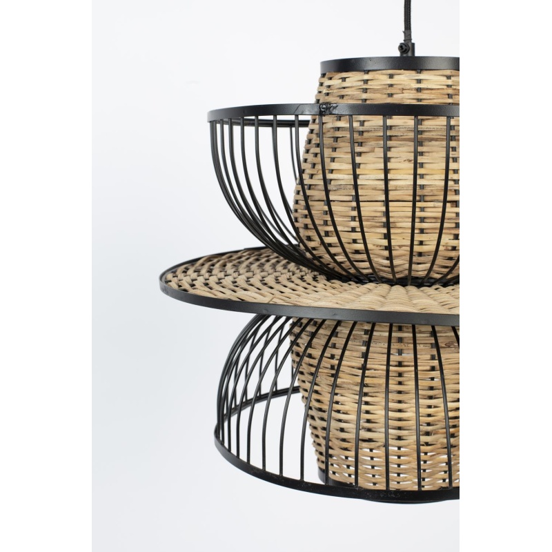 | Tuotteen kuvaus | Musta jauhemaalattu teräsrunko, jossa luonnonrottinkilamppu. PVC-kaapeli mustaa puuvillakangasta. |