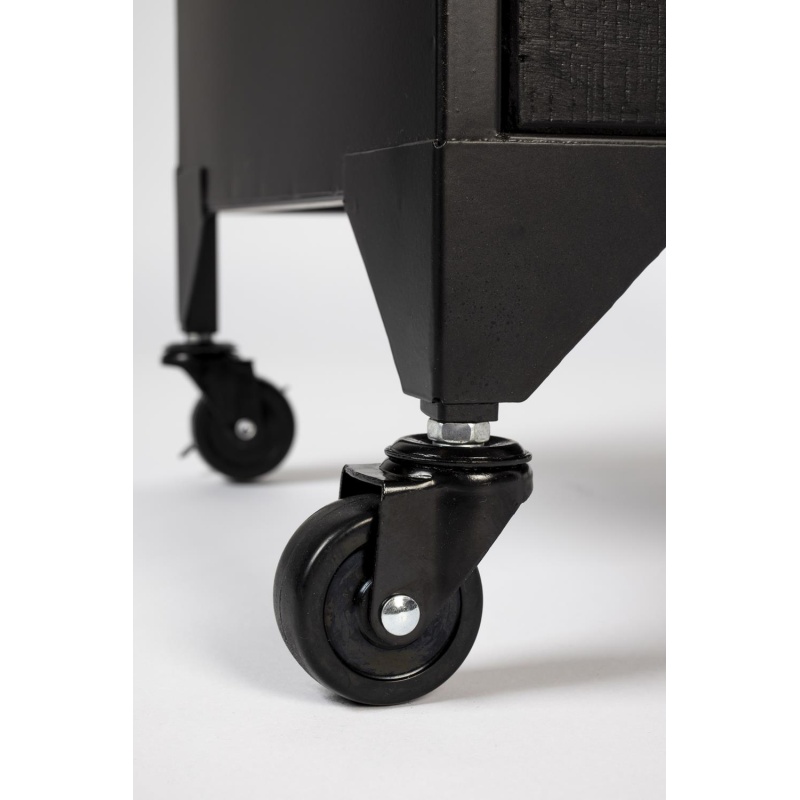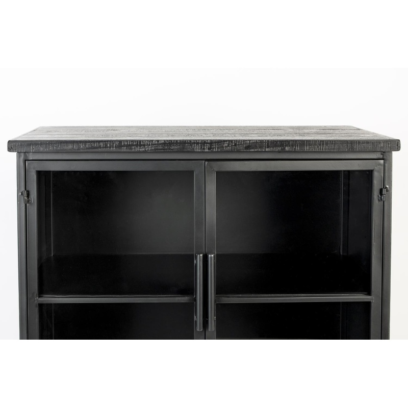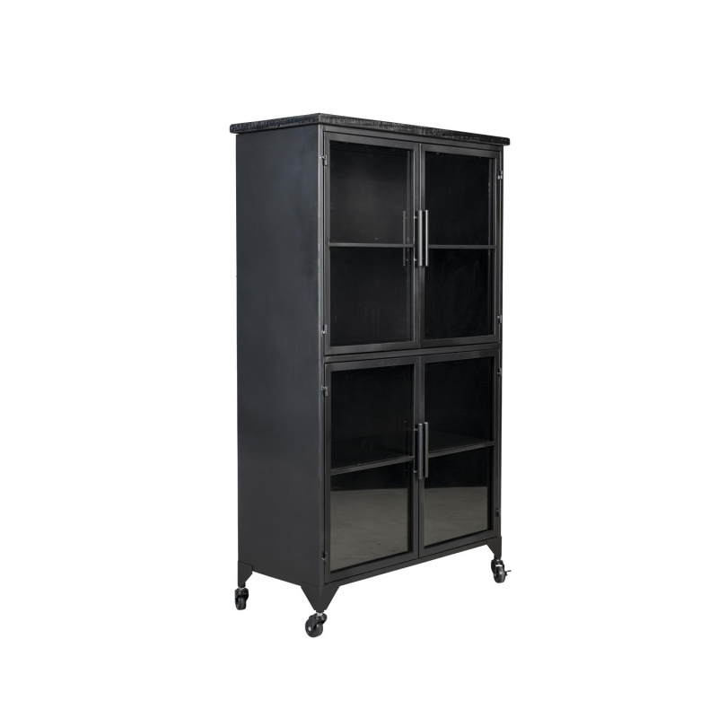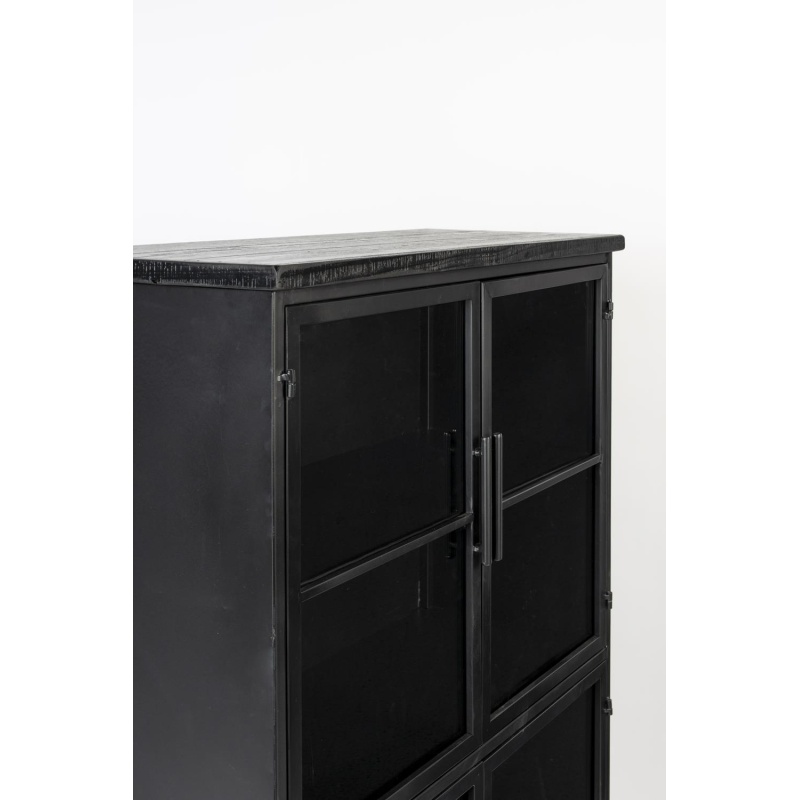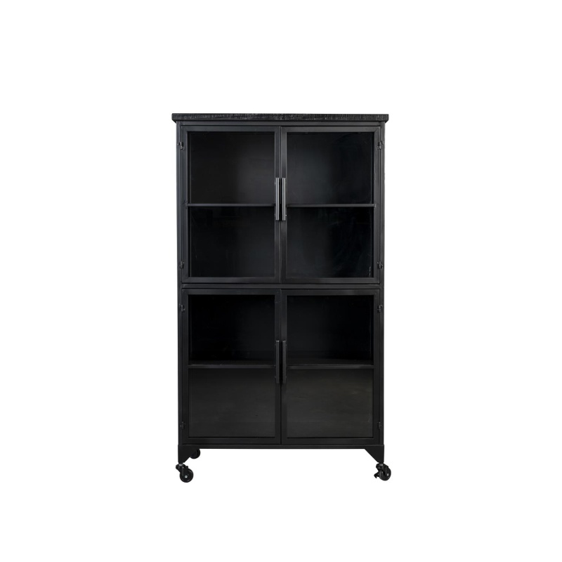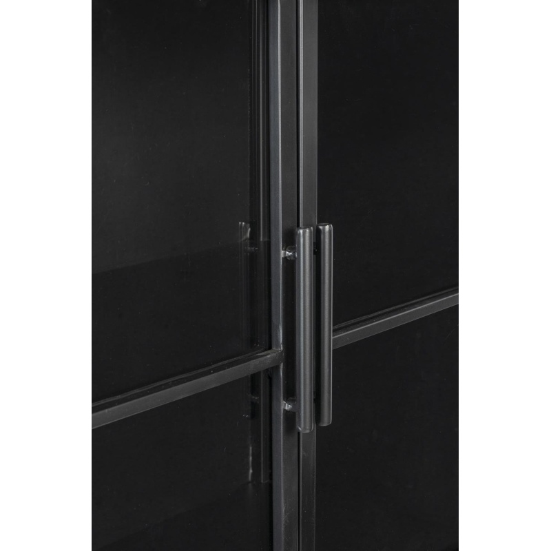| Tuotteen kuvaus | Lakattua MDF-levyä ja kuusivaneria yläosassa ja laatikossa. Musta lakkapinnoite. Musta jauhemaalattu rauta. Kirkas karkaistu llasi. 3 kiinteää hyllyä ja 4 ovea. 2 lukittavaa pyörää. |